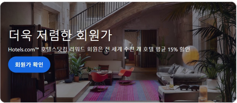 호텔 예약 전문 사이트로 다양한 리워드 혜택을 받을 수 있고, 무료 회원 가입시 평균 15%의 할인 혜택을 제공합니다.