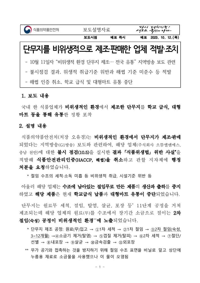 폐수 단무지 업체 식약처 적발. 조치 사항