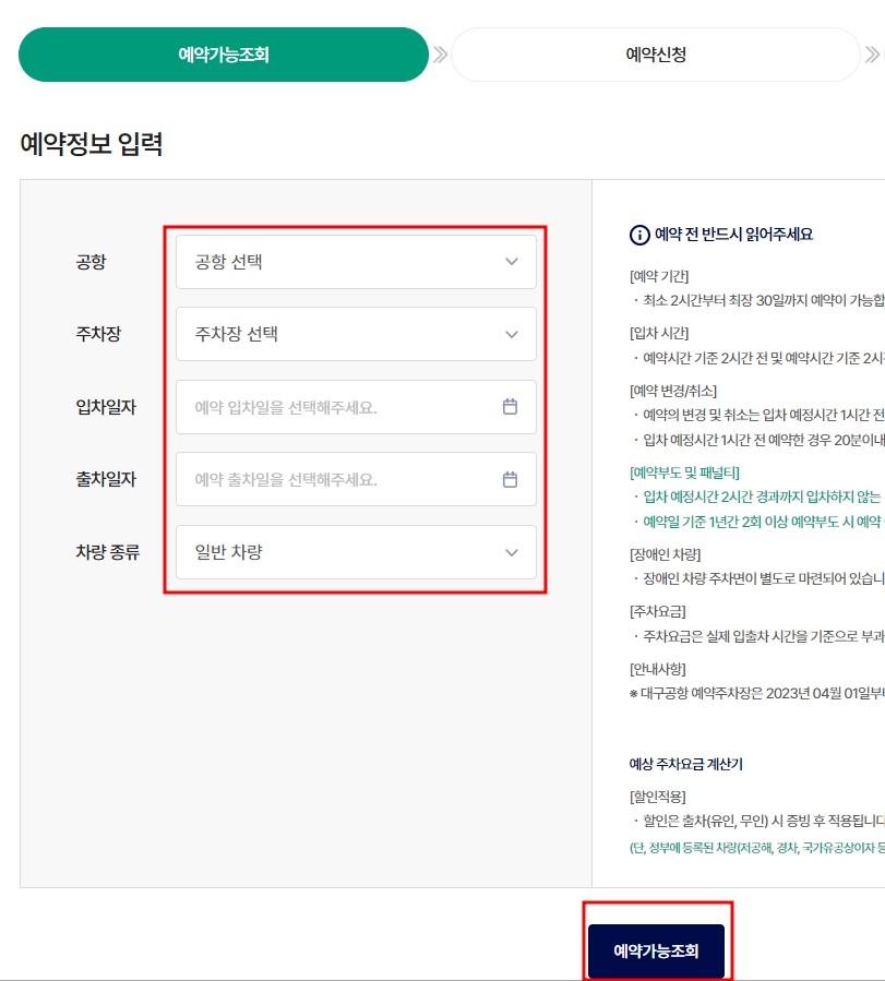 예약정보 입력란에서 이용하실 공항과 주차장을 선택하시고