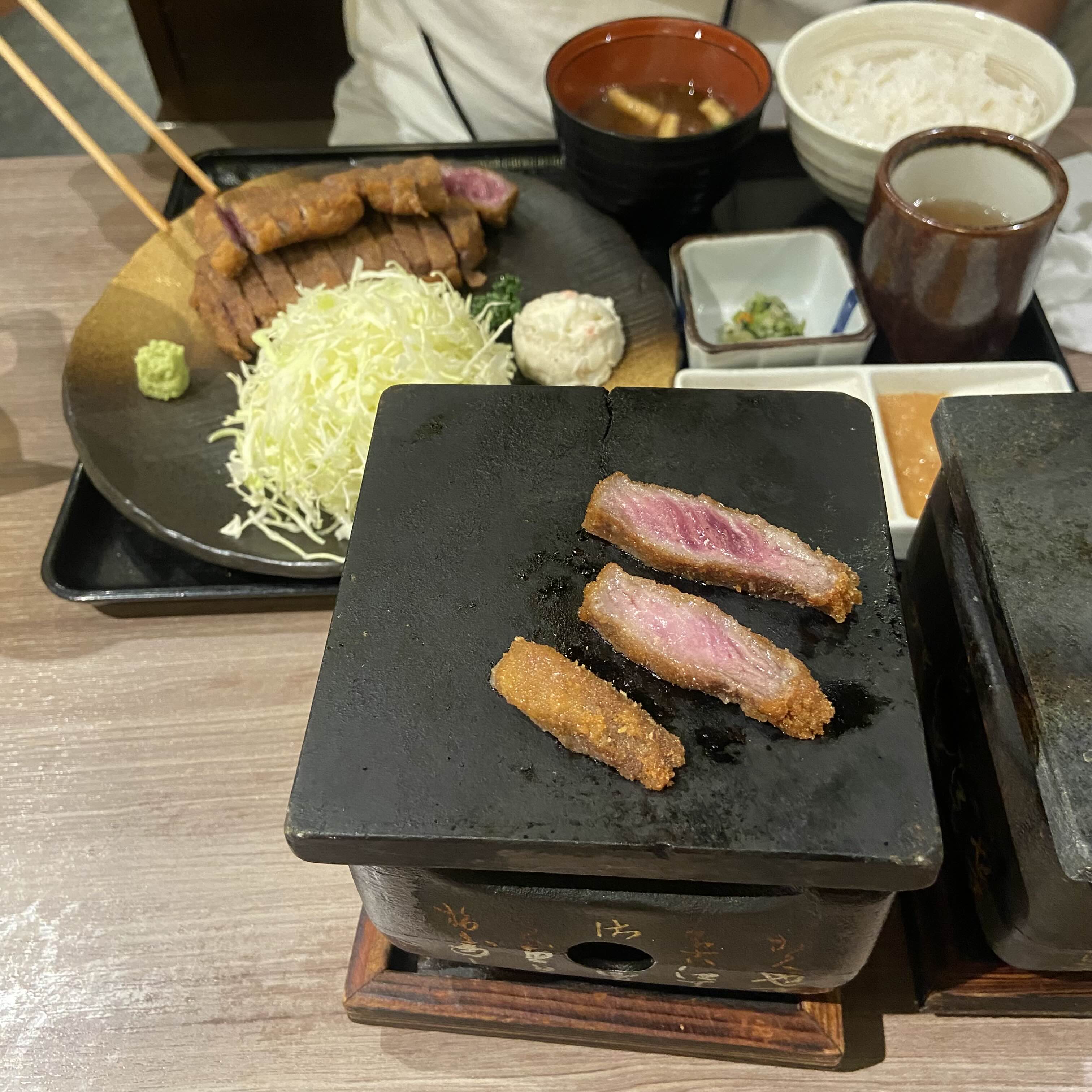 미디엄 레어에 튀긴 소고기 카츠를 돌판에 구워서 와사비 간장으로 드세요.