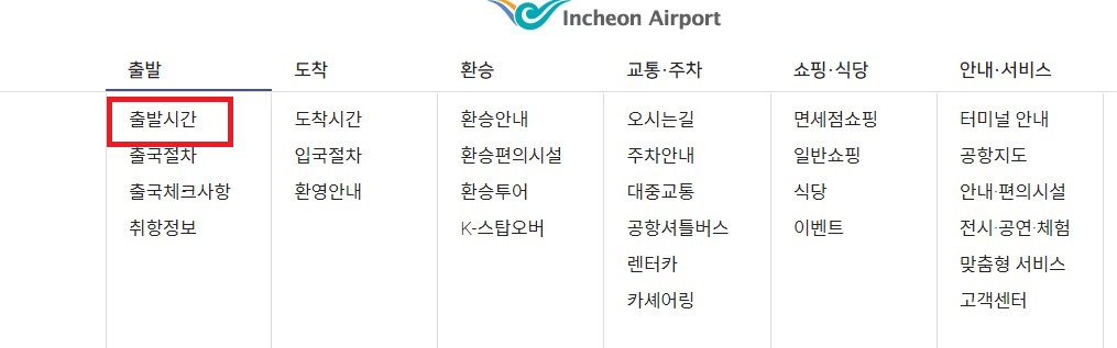먼저 인천국제공항 홈페이지에 들어가셔서 출발>출발시간을 클릭합니다.