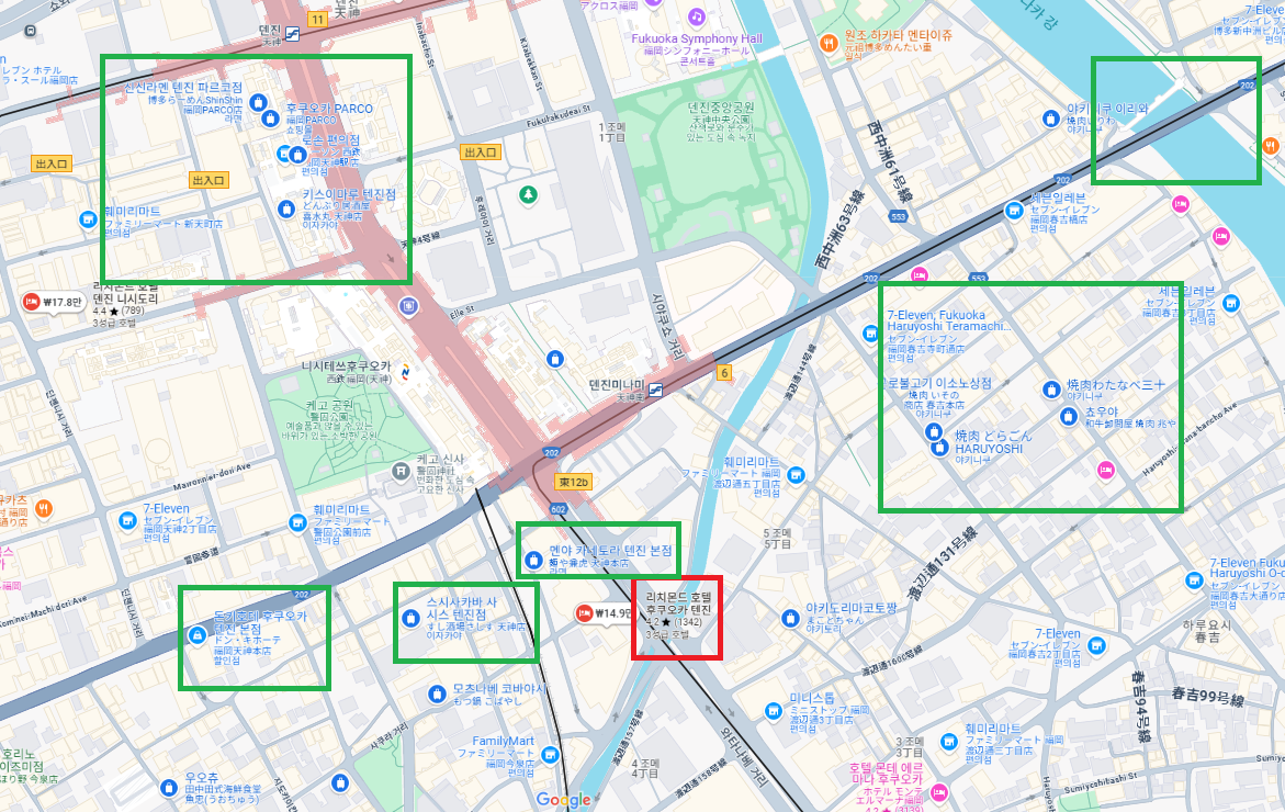 텐진 지하상가와도 걸어서 3분정도 거리이고 돈키호테 텐진, 파르코, 미나텐진, 텐진 내 백화점까지 모두 걸어서 10분-15분 내외로 다닐 수 있어 굉장히 편리합니다. 쇼핑하다가 중간에 호텔와서 쉬고 짐 내려놓고 다시 나가기 좋습니다.