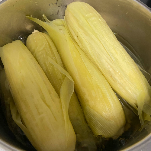 - 옥수수 속껍질을 남겨둔 채 솥에 넣고 물이 옥수수를 채울정도로 넣어주세요.