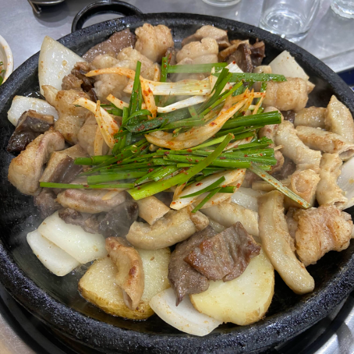 모듬소곱창입니다. 곱창, 양, 대창, 염통 그리고 감자와 양파, 부추무침까지 올려서 먹으면 정말 꿀맛!