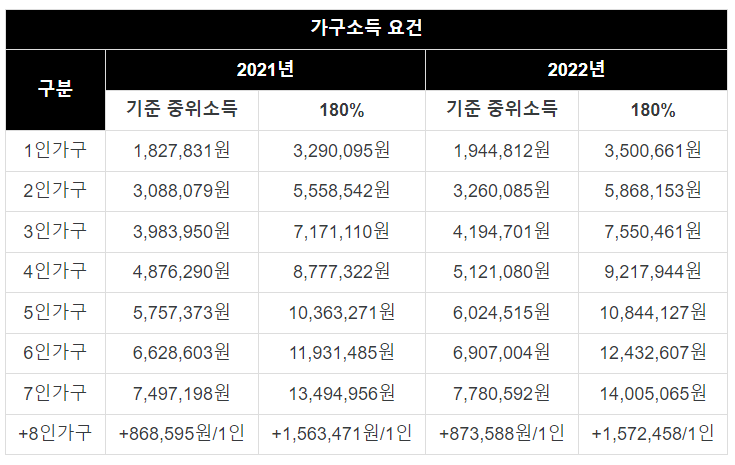 - 가구소득: 중위소득의 180% 이하