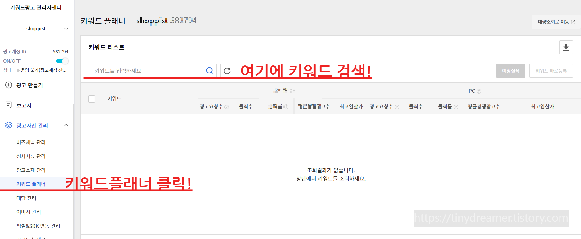 하단에 키워드 플래너를 클릭해주세요. 키워드 플래너로 포스팅에 필요한 키워드를 검색해보세요.