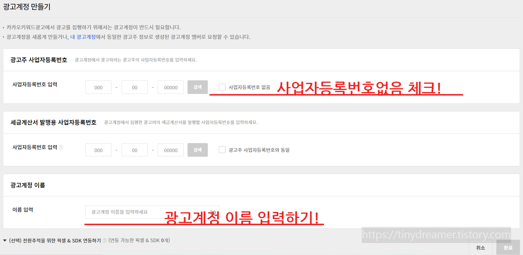 카카오 비즈니스에서 광고계정을 생성합니다. 우리는 광고주도 아니고 사업자도 아니기 때문에