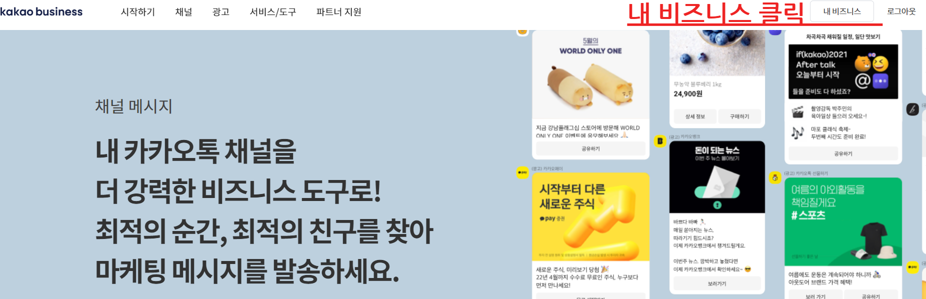 카카오비즈니스 2. 사이트 우측상단의 내 비즈니스 클릭하세요.