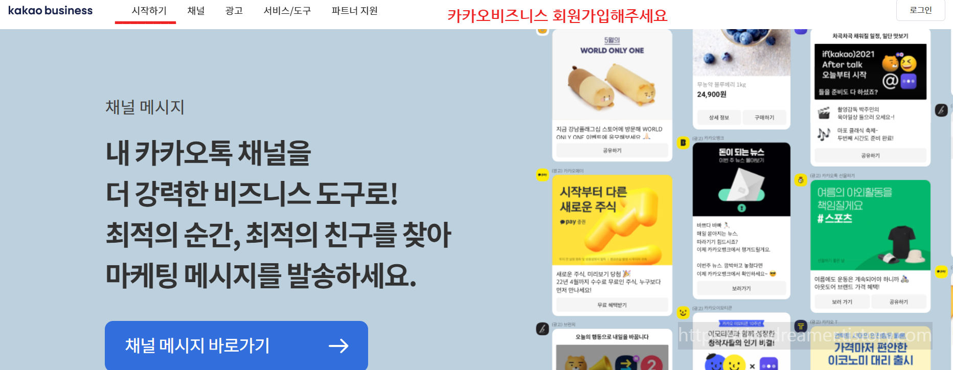 카카오 비즈니스 사이트에서 시작하기 or 로그인을 누르시고 회원가입을 해주세요.