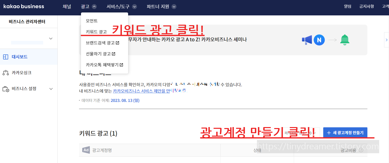 카카오 비즈니스 3. 광고>키워드광고>광고계정 만들기