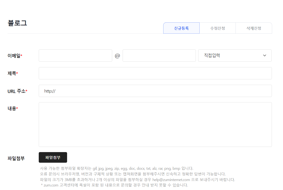 줌 고객센터 3. 블로그 "신규등록"을 눌러 내 정보를 입력합니다.