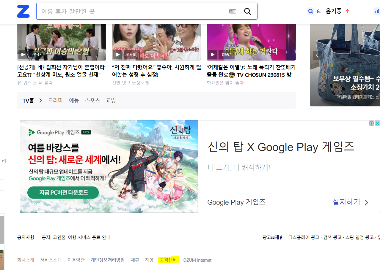 1. 먼저 줌(ZUM) 사이트에 접속후, 메인 페이지 하단의 "고객센터"를 클릭해주세요.