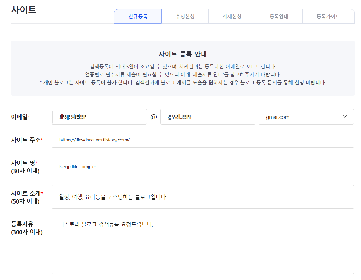이메일, 사이트주소, 사이트 명, 사이트 소개, 등록사유를 입력합니다.